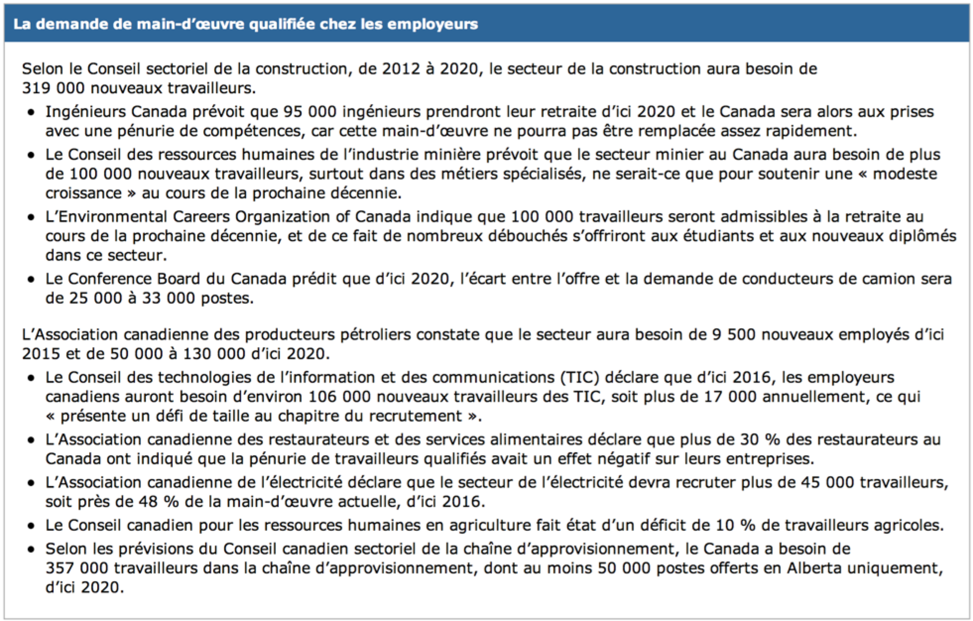 On recense à l’heure actuelle des milliers d’emplois à combler au Canada, ce qui limite les possibilités de croissance du pays. En fait, dans un rapport publié en décembre 2012, la société Marchés mondiaux CIBC Inc. affirme que 30 % des entreprises au Canada sont aux prises avec une pénurie de main-d’œuvre qualifiée. En outre, la Fédération canadienne de l’entreprise indépendante signalait dans son rapport Baromètre des affaires que 34 % des petites et moyennes entreprises soutiennent que la « pénurie de main-d’œuvre qualifiée » constitue un obstacle à la croissance. Pendant la reprise, les difficultés d’embauche se sont accrues et cela devient un problème majeur pour les employeurs d’un certain nombre de secteurs et de régions. On note en particulier des zones où persistent des postes vacants destinés à des gens de métier spécialisés et des professionnels, comme des électriciens, des menuisiers, des machinistes, des opérateurs d’équipement lourd, des ingénieurs et des architectes.