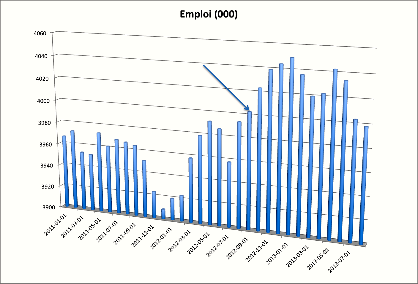 On voit bien le repli en début d’année puis un sursaut. Le tableau qui suit présente les variations mensuelle de l’emploi (en 000) corrigées des variations saisonnières à partir du début de 2013. On y voit bien les hésitations que met en évidence le graphique.